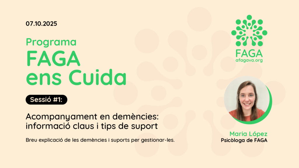 La primera SESSIÓ és el proper dimarts 7 d’octubre de 2025, de 17:30 a 19:00h, al Centre Terapèutic de FAGA. Acompanyament en les demències. La nostra psicòloga de FAGA, Maria López, et donarà informació, claus i tips de suport per fer servir cada dia.